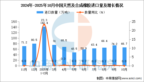 中商情报网讯:据中商工业研讨院数据库显现,2025年10月我国天然及合成橡胶(包含胶乳)进口量66.7万吨,同比增加相等;1-10月我国天然及合成橡胶(包含胶乳)累计进口量678.2万吨,同比增加17.2%。